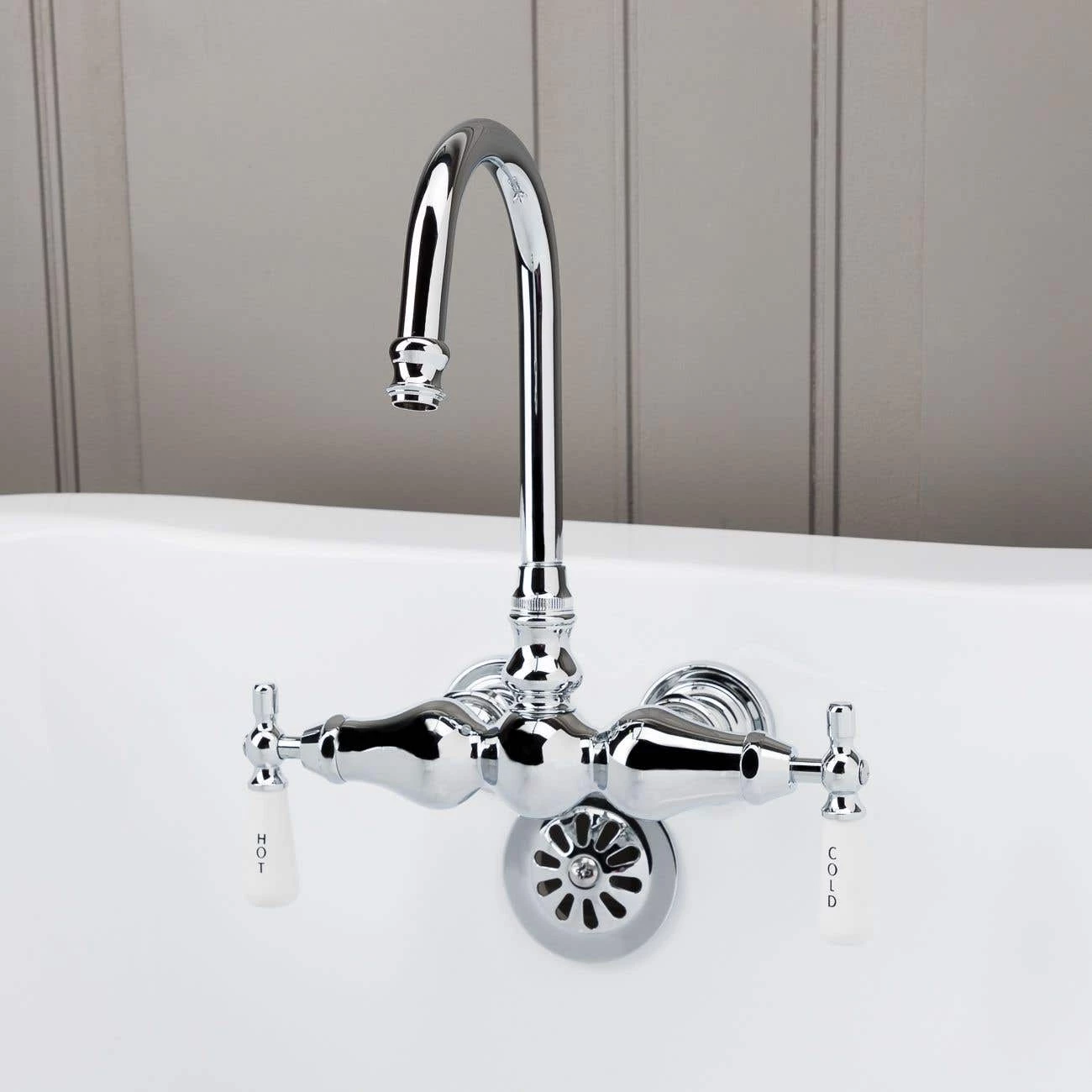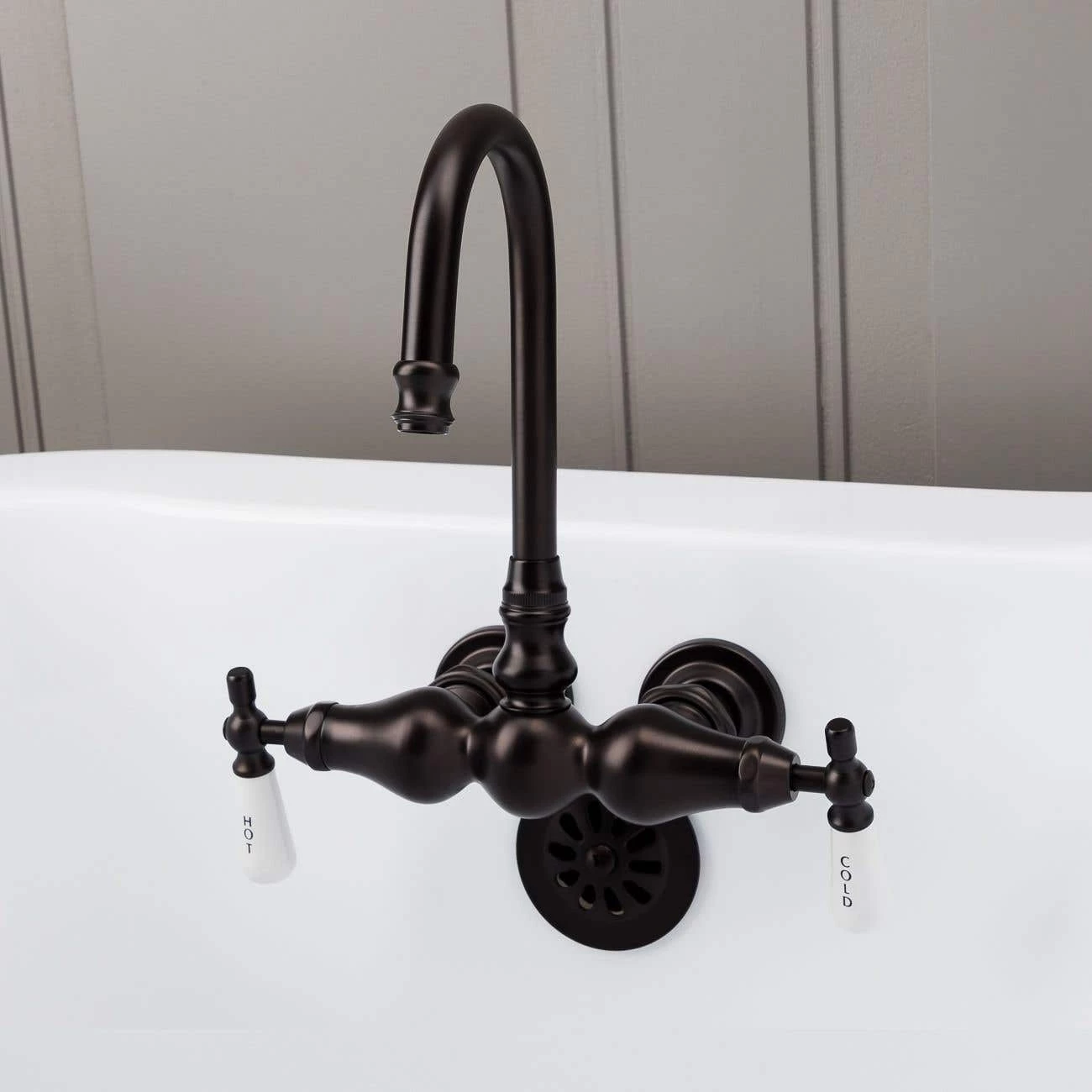 This classically designed three-ball leg tub faucet is a classic addition to your clawfoot bathtub. The shapely gooseneck spout and premium porcelain lever handles add to the elegance of the faucet. Available in glossy chrome, contemporary brushed nickel, or oil-rubbed bronze for a vintage tub faucet vibe, this clawfoot tub gooseneck faucet is both timeless and fresh. Constructed of premium quality solid brass, this faucet offers durability while remaining pristine; each premium finish is resistant to tarnishing and corrosion, so it will look just as good down the road as it does the day you install it.