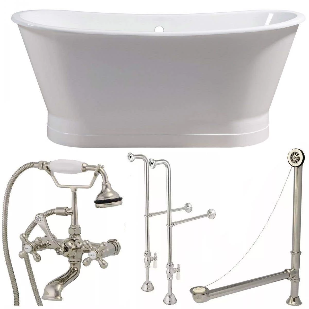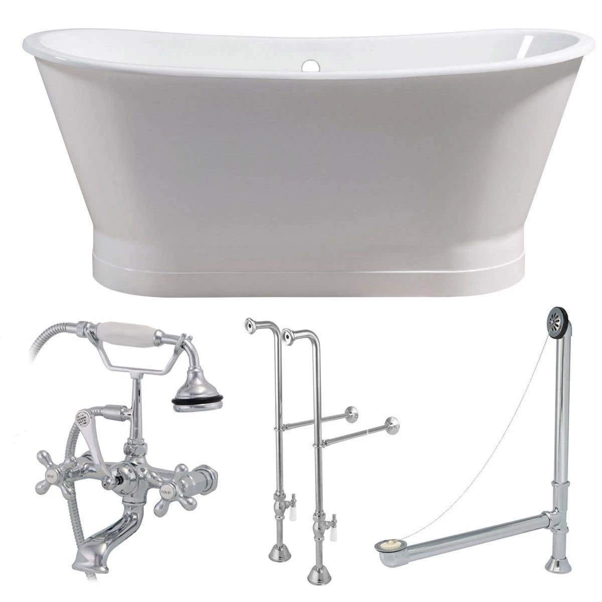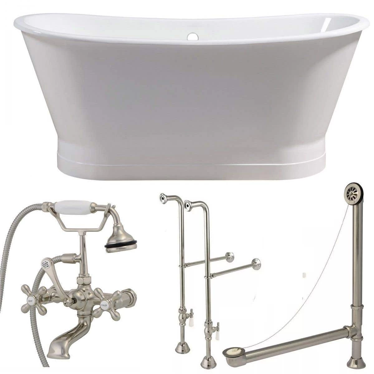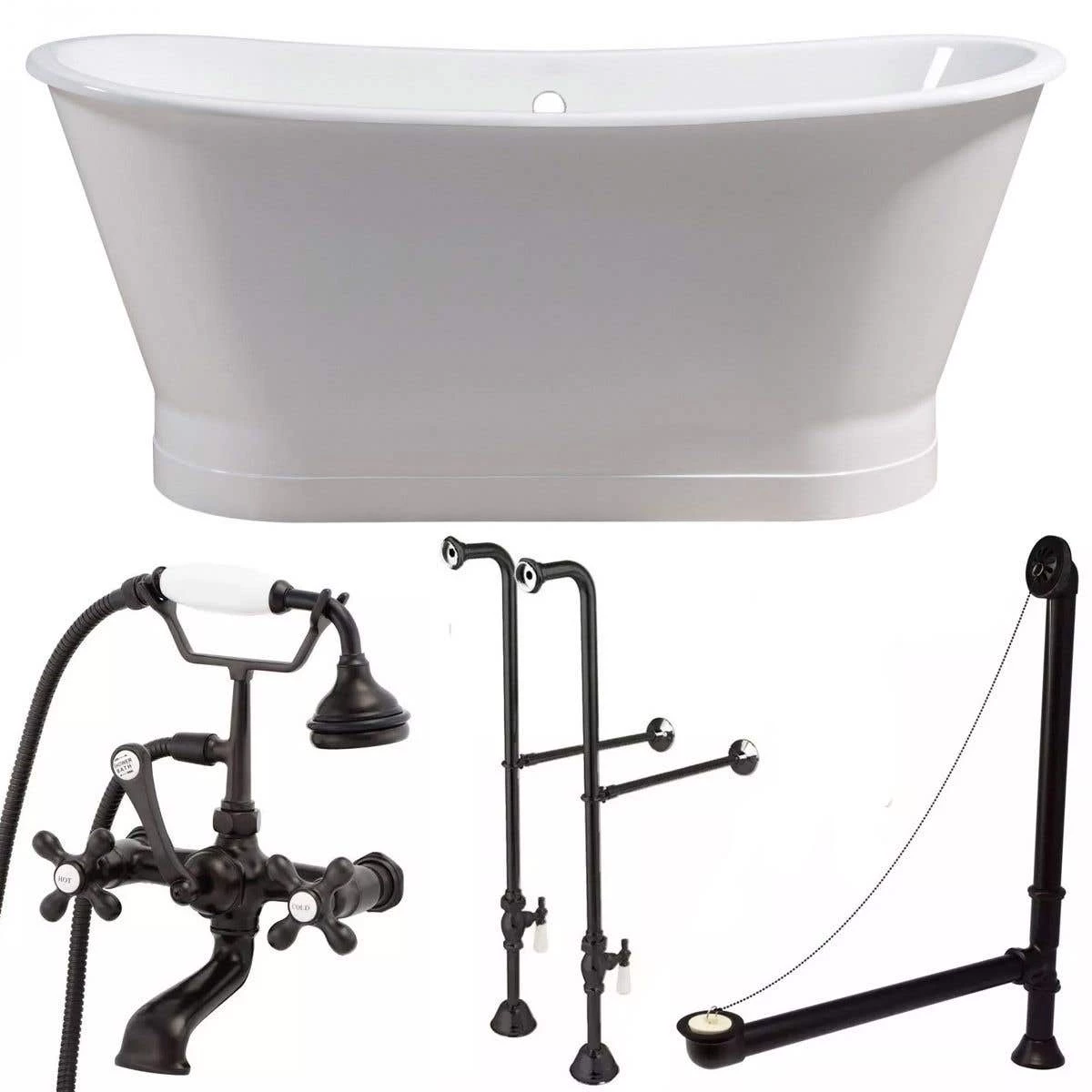 - Package includes: 67 Inch Cast Iron Double Ended Skirted Tub, Freestanding English Telephone Faucet with Handshower, and Chain & Stopper Drain