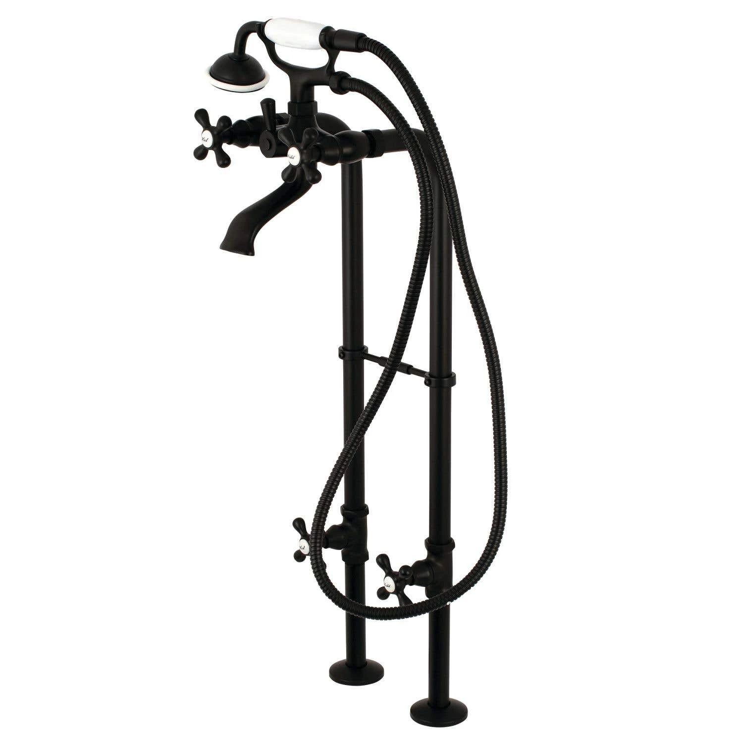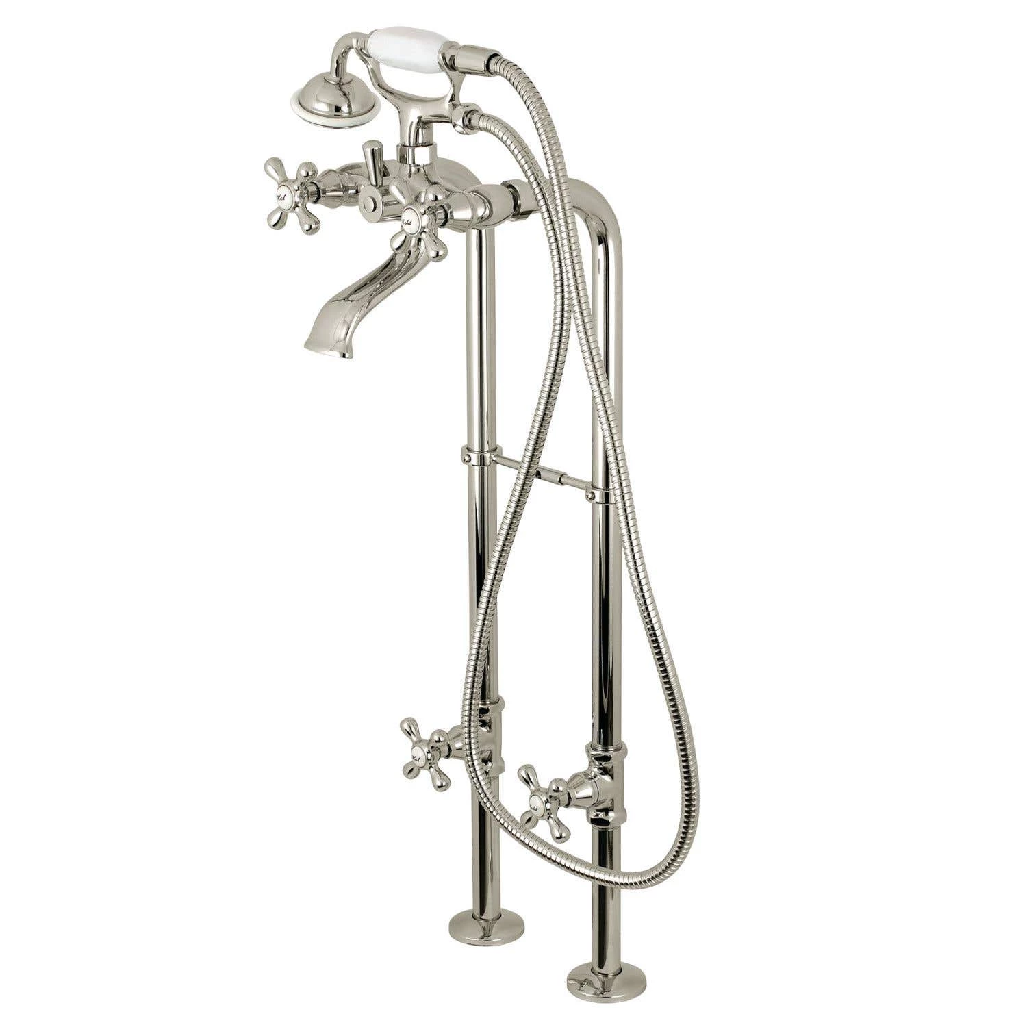 Unity in balance and support is what this freestanding tub faucet embodies with an included supply line, stop valve and handle from the Kingston Collection. Composed from solid brass material, this tub and shower set features a floor-mount installation and spout water flow rate of 7.0 GPM/26.5 LPM at 80 PSI, while the hand shower provides a water flow rate of 1.8 GPM/6.8 LPM at 80 PSI. Excellence of endurance and reliability is emboldened by a corrosion-resistant finish, embellish your home ensemble with this tub faucet and parts set.
