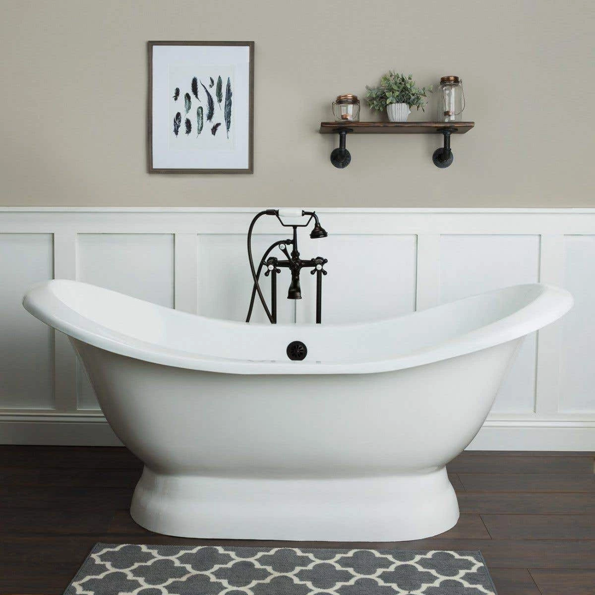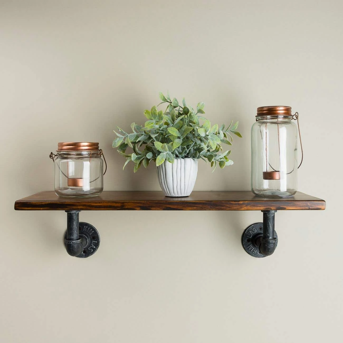 This industrial style solid oak bathroom shelf features metal pipes as the shelf brackets. The recycled wood bathroom shelf has a rustic charm that is sure to stand out in your bathroom’s decor.
