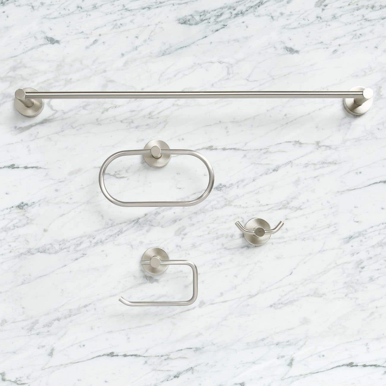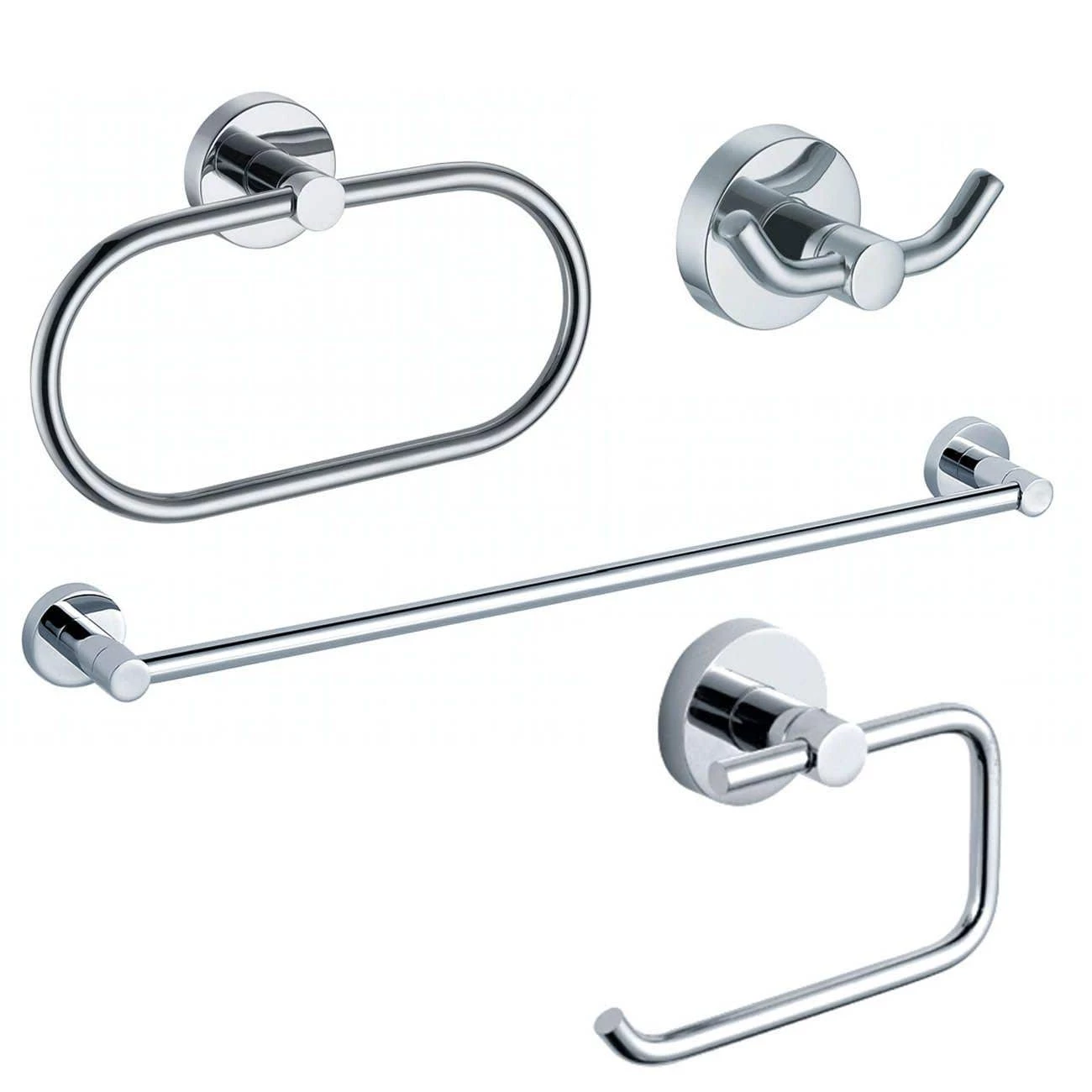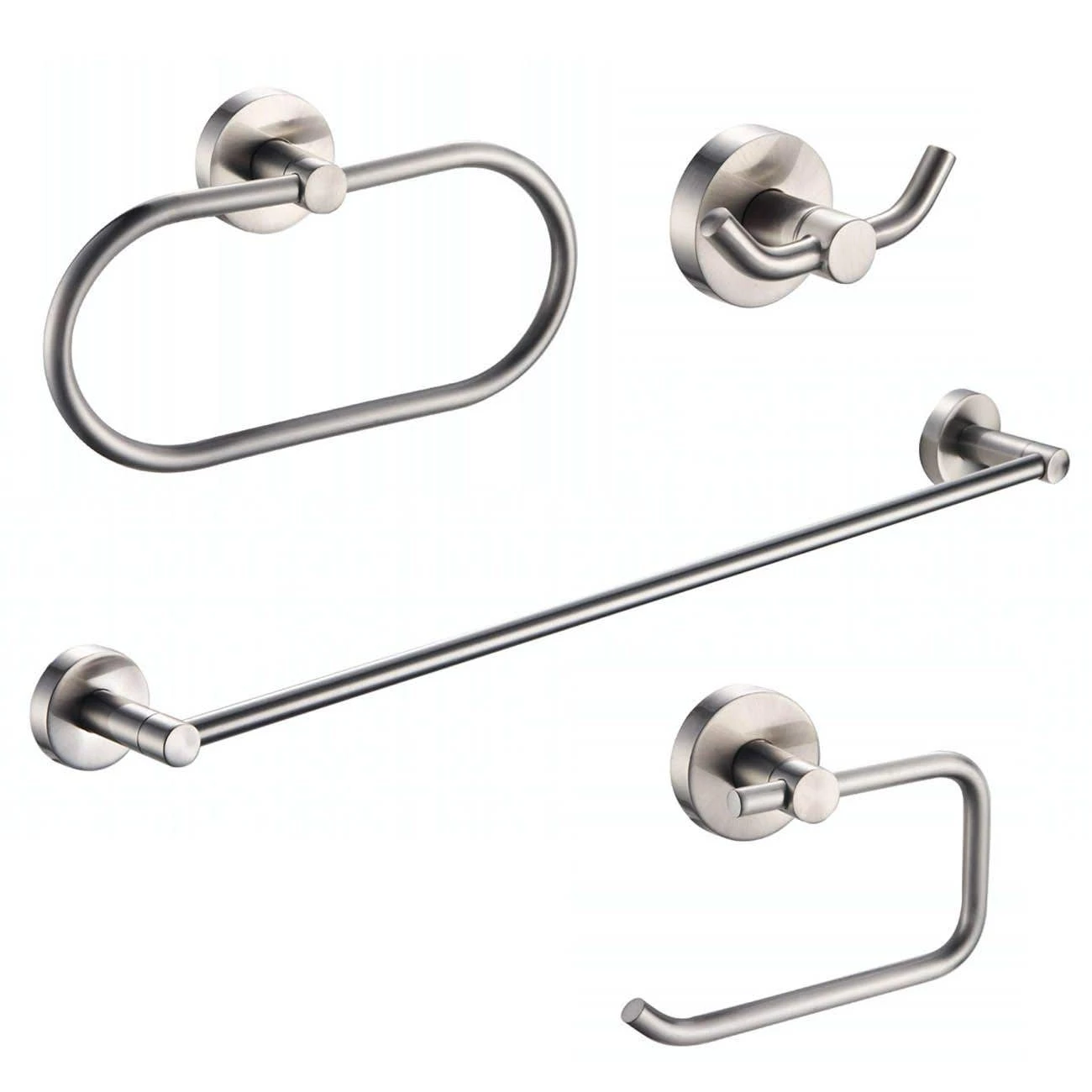 - Set includes: 24″ Towel Bar, Double Robe Hook, Towel Ring and Toilet Paper Holder