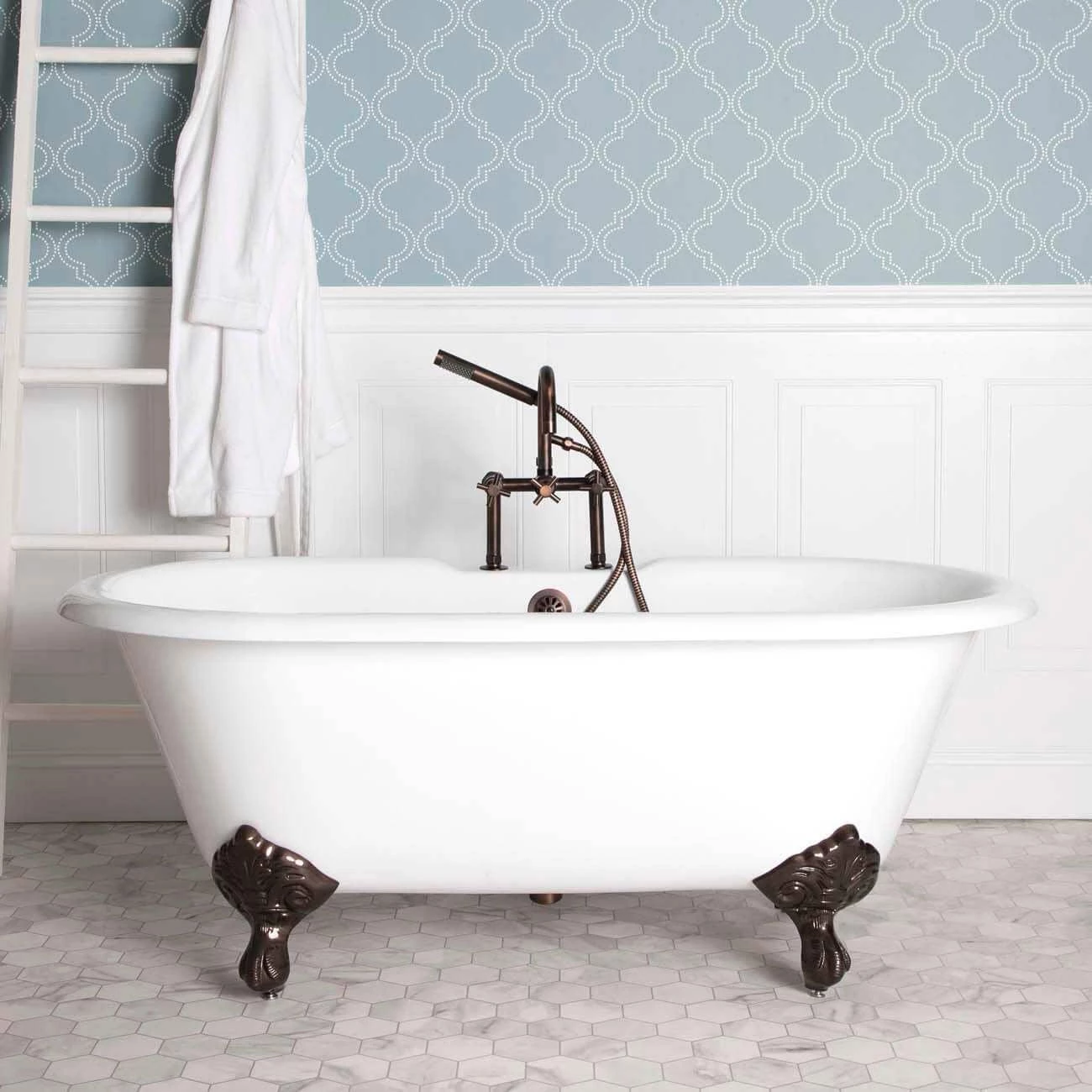 Indulge in the timeless elegance of the Kensington Double Ended Clawfoot Tub. Crafted with superior quality, this cast iron clawfoot bathtub features a sophisticated oval tub design, offering a spacious interior that accommodates two. Enjoy the comfort of the double ended bathtub style that allows you to recline at either end. A perfect blend of form and function, this clawfoot bathtub is made to complete your bathroom oasis.
