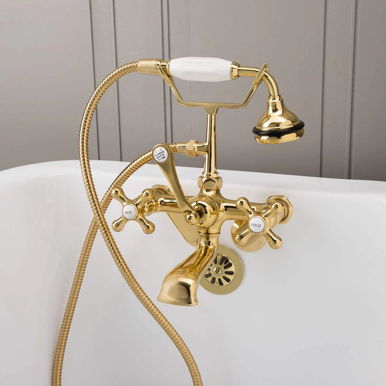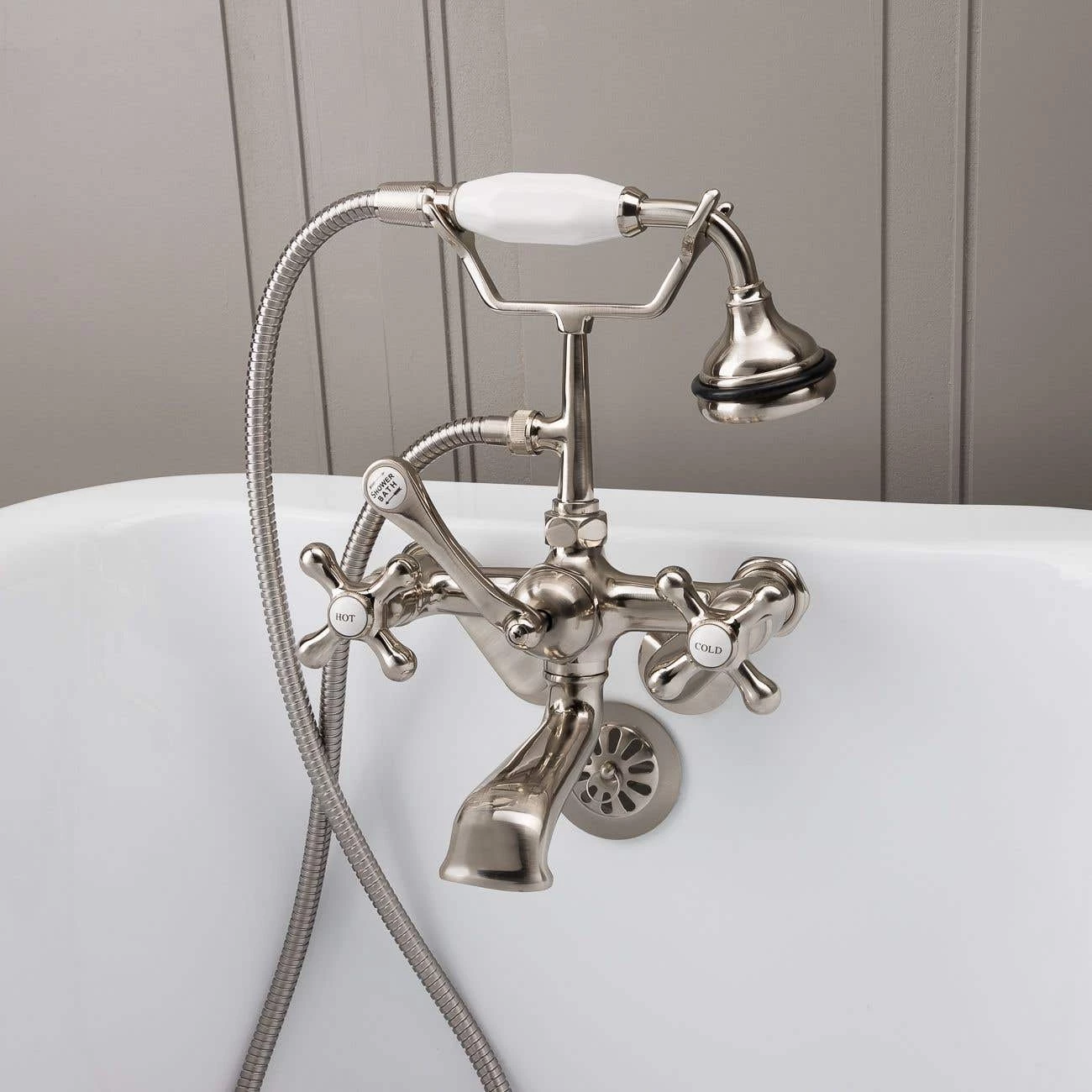 This low spout clawfoot tub faucet is a must-have addition to any clawfoot tub. Designed to mount to the wall of the bathtub, this faucet features a stately low spout, metal cross handles with premium porcelain lettered inlays, and a British telephone-style hand shower with a porcelain handle. Solid brass construction ensures lasting durability, while ceramic quarter-turn valves offer smooth, drip-free operation, offering endless relaxation.