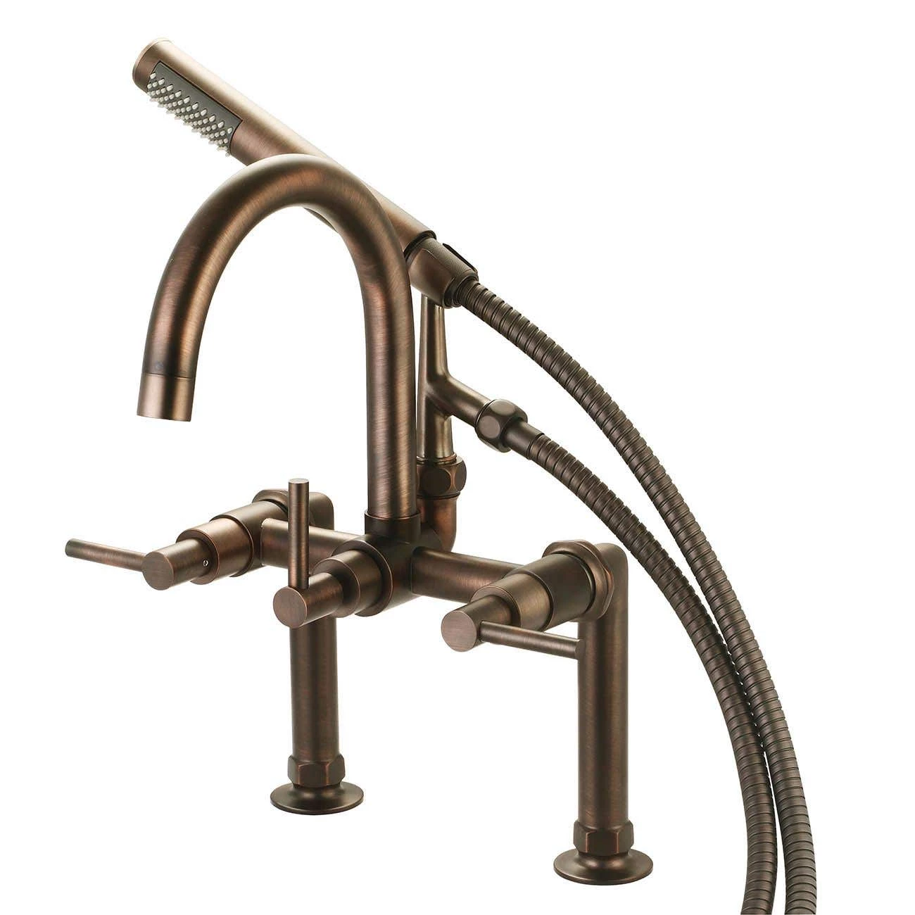 This modern deck mount bathtub faucet with hand shower is the perfect addition to your freestanding or clawfoot tub. Available in three sleek finishes, this deck-mount tub faucet with sprayer is the perfect complement to the modern gooseneck sink in your bathroom, as well as a range of contemporary hardware designs. It features a simplistic cylindrical design that complements a modern bathroom. Constructed of solid brass, metal lever handles, and a hand shower, this bathtub faucet is a stylish addition to your space. If you’re looking for a clawfoot tub gooseneck faucet that’s lovely and refined with the function of a hand shower, this design is ideal.