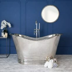 The Melody Freestanding Copper Tub is beautifully decorated with horizontal ribbing and rivets near the bottom. This double slipper bathtub features a satin nickel interior and exterior. Give your new bathroom a warm, rustic feel with this eye-catching tub.